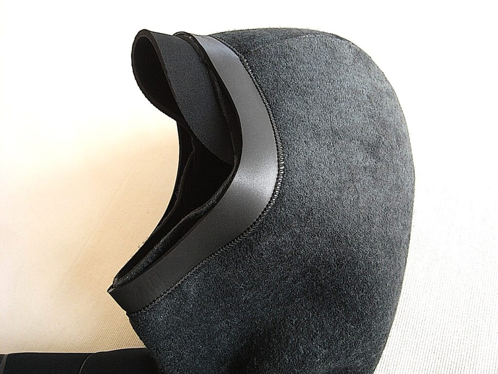 スーツとセパレートで被る一般的なキャップはこの状態になると首に圧迫を感じますが、このフード一体型ではその圧迫がない。